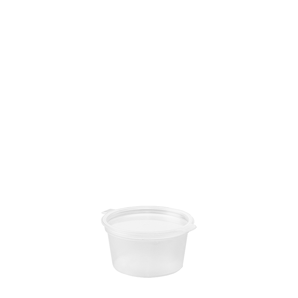 Molheira com tampa em PP 3 cl (30 ml) transparente e empilhável. Dose controlada para molhos e toppings, ideal para restauração, eventos e take-away.