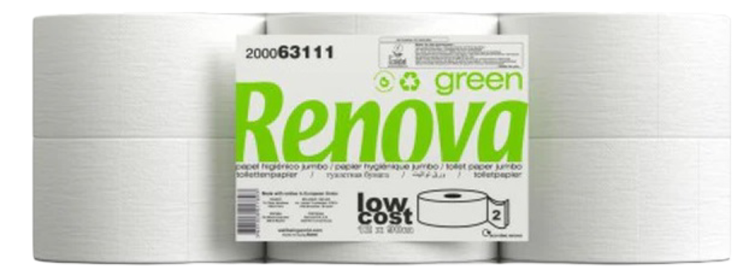 Papel higiénico industrial jumbo Renova Green com 90 metros e folha dupla. Papel 100% reciclado suave, absorvente e resistente.